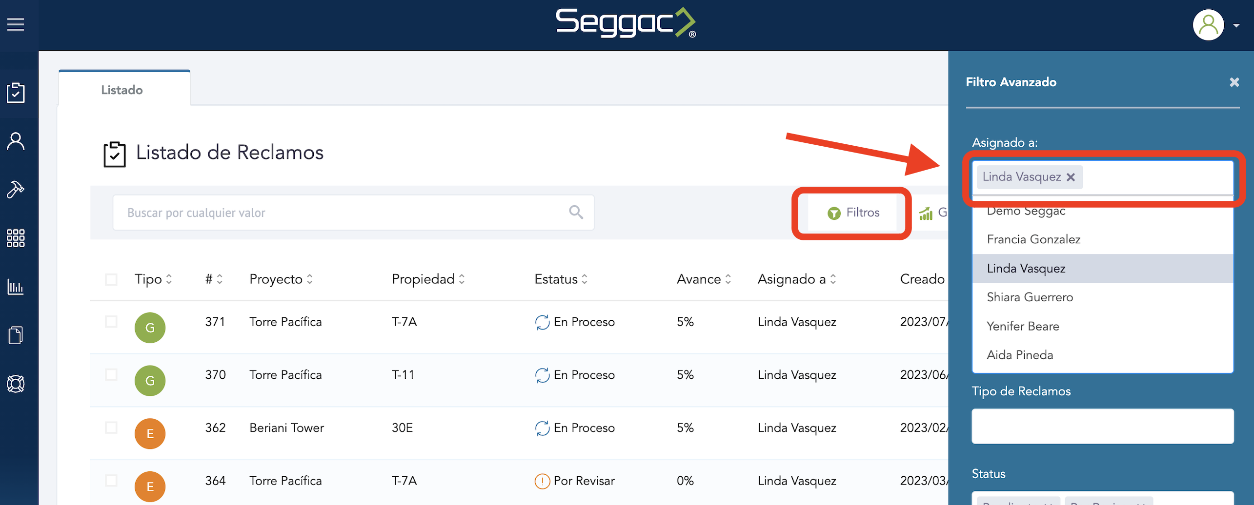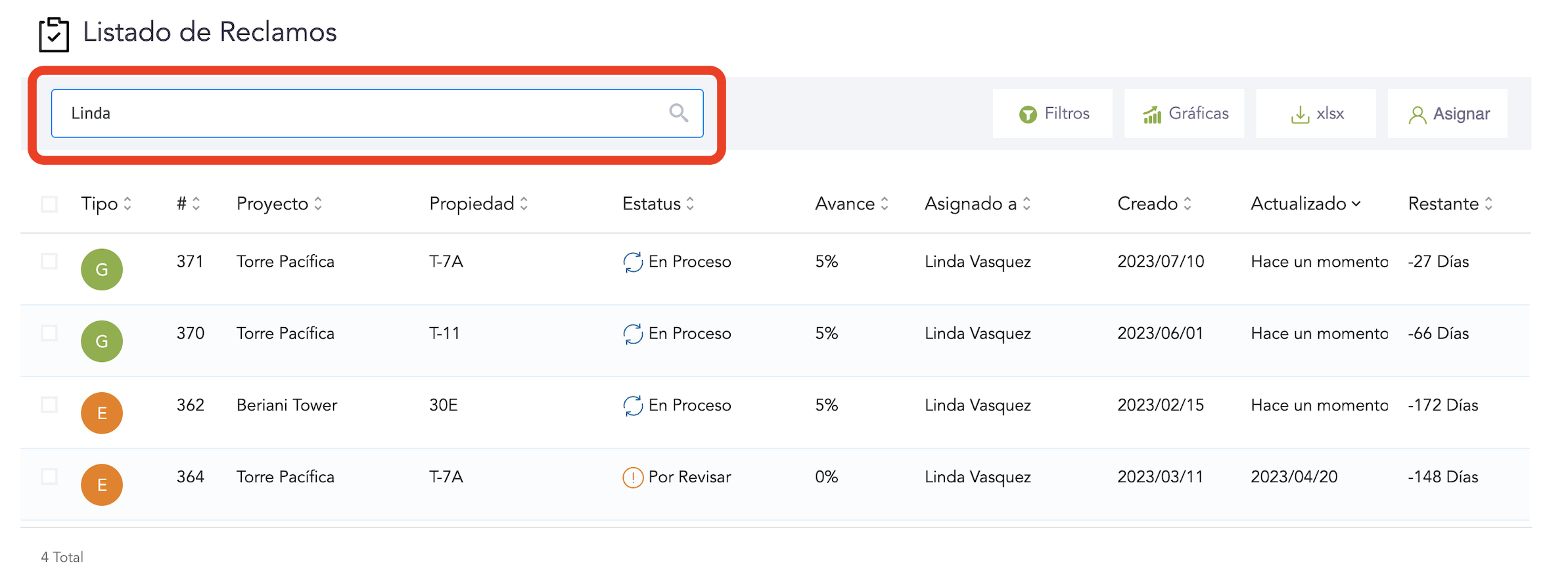 Luego que los reclamos han sido asignados a usuarios, en ocasiones tendrás la necesidad de hacer búsquedas o filtros para trabajar en base a ello.