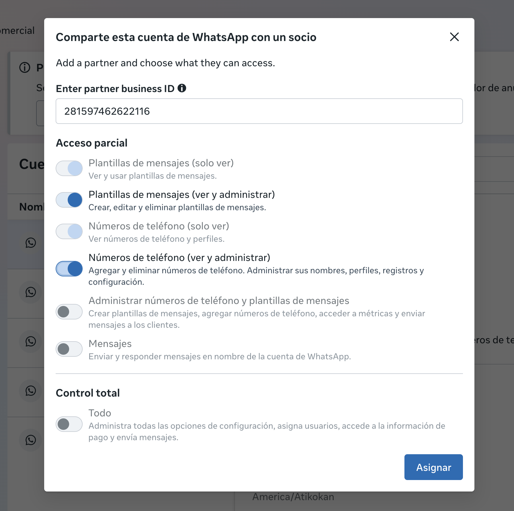 - Otorga estos dos permisos: Plantillas de mensajes (ver y administrar) + Números de teléfono (ver y administrar)
